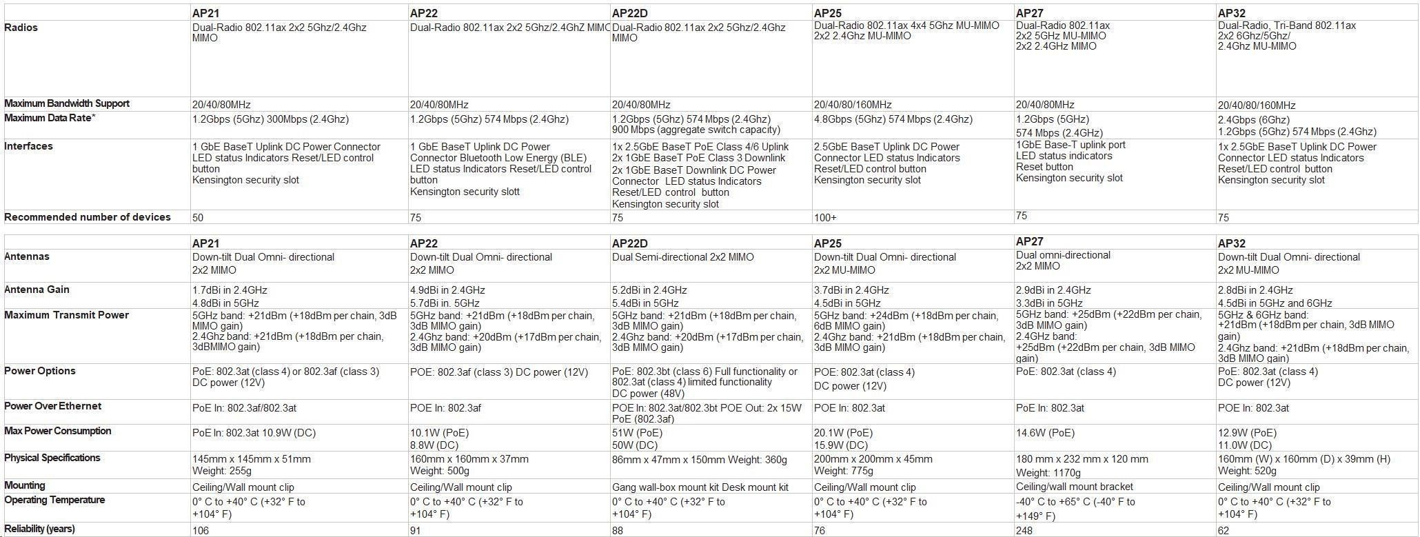 | Interfaces | 1 GbE BaseT Uplink DC Power Connector LED status Indicators Reset/LED control button Kensington security slot | 1 GbE BaseT Uplink DC Power Connector Bluetooth Low Energy (BLE) LED status Indicators Reset/LED control button Kensington security slott | 1x 2.5GbE BaseT PoE Class 4/6 Uplink 2x 1GbE BaseT PoE Class 3 Downlink 2x 1GbE BaseT Downlink DC Power Connector LED status Indicators Reset/LED control button Kensington security slot | 2.5GbE BaseT Uplink DC Power Connector LED status Indicators Reset/LED control button Kensington security slot | 1GbE Base-T uplink port LED status indicators Reset button Kensington security slot | 1x 2.5GbE BaseT Uplink DC Power Connector LED status Indicators Reset/LED control button Kensington security slot |