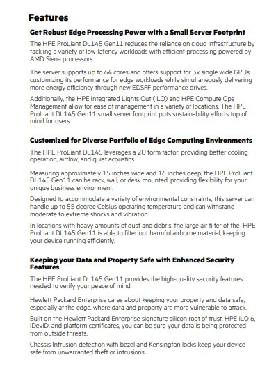 Server HPE ProLiant DL145 Gen11 je 2U, jednoprocesorový, robustní server edge computing navržený tak, aby vyhovoval potřebám maloobchodu, výroby, telekomunikací a různých dalších odvětví. Nabízí přesvědčivou alternativu k tradičním serverům s elegantním designem, dostupnou cenou a tichým provozem.