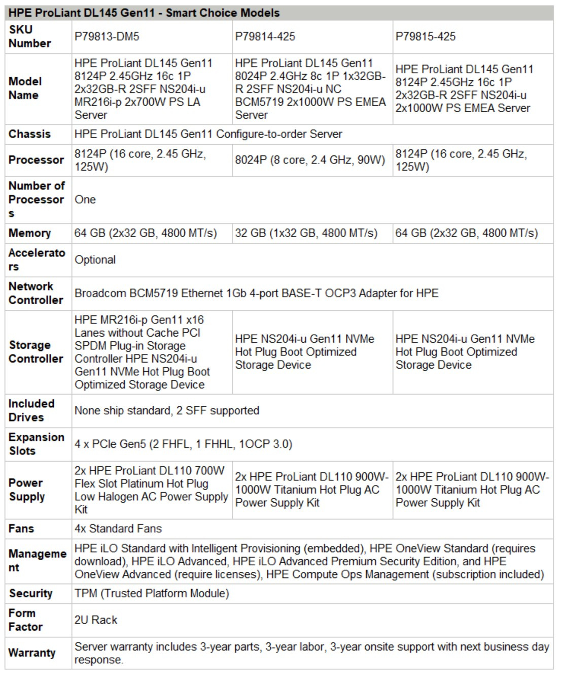 | Model Name | HPE ProLiant DL145 Gen11 8124P 2.45GHz 16c 1P 2x32GB-R 2SFF NS204i-u 2x1000W PS EMEA Server |