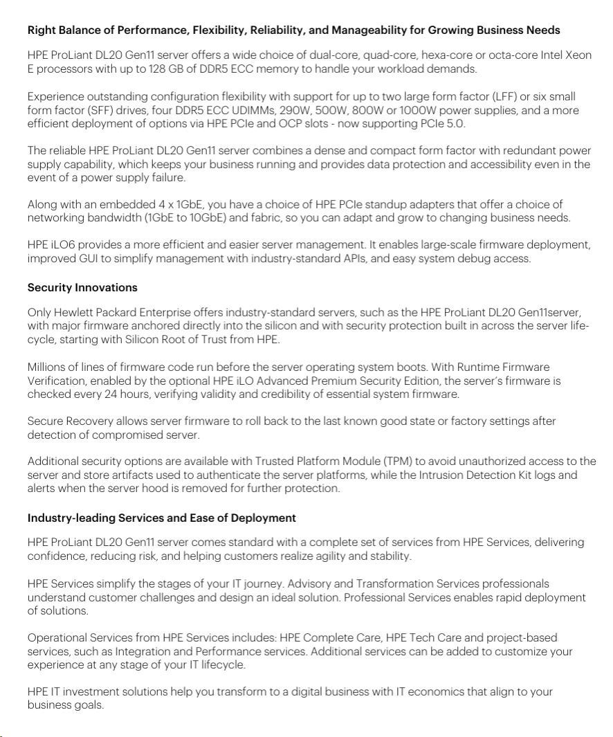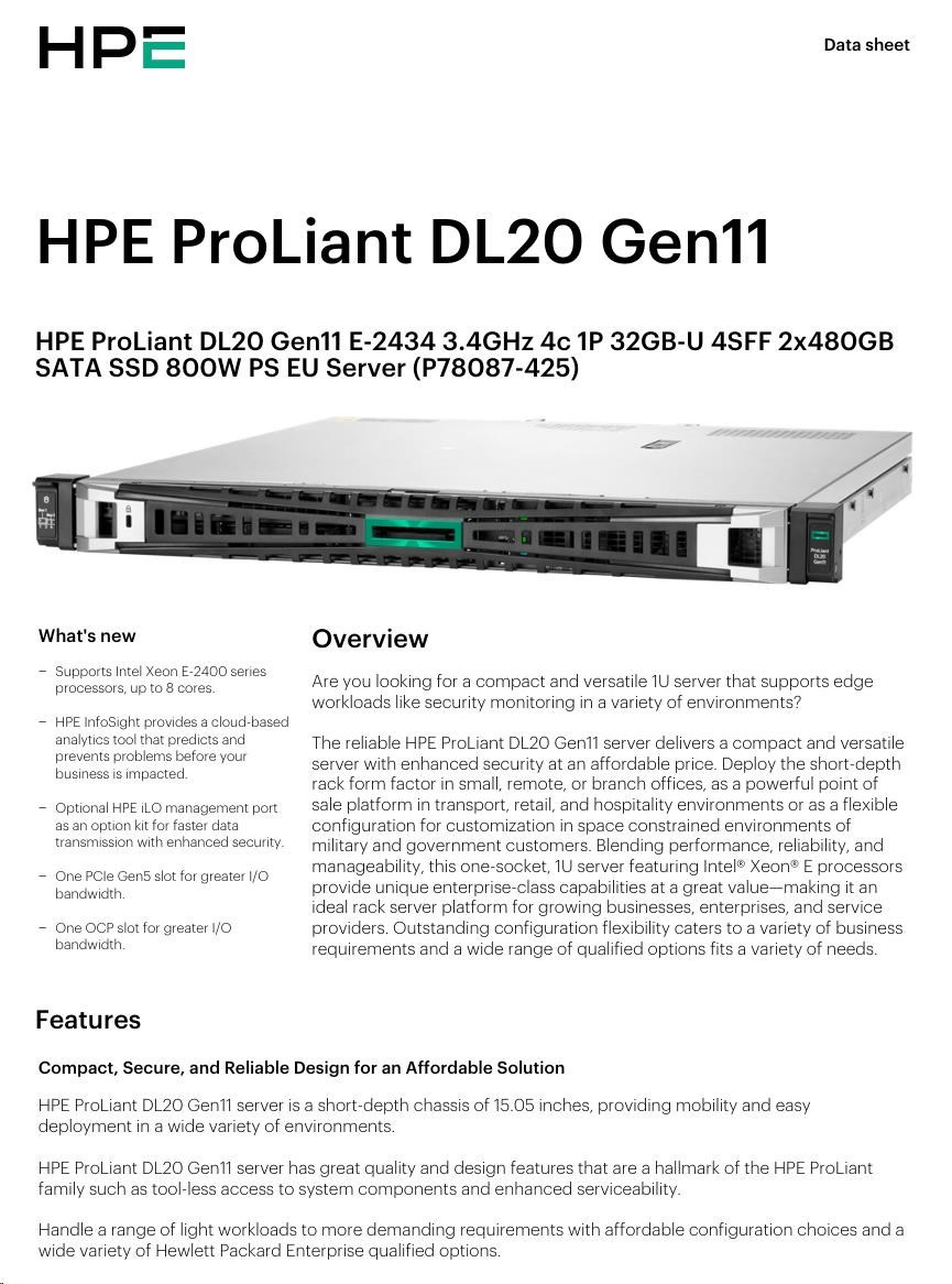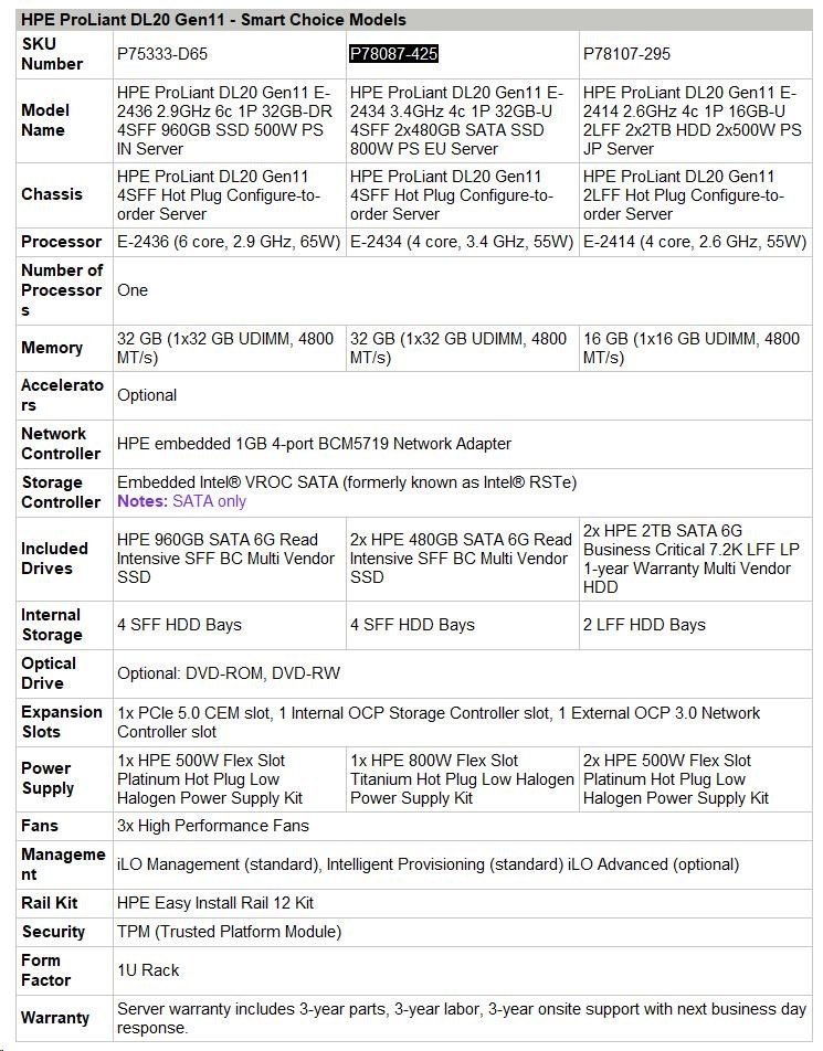 HPE PL DL20g11 E-2434 (3.4G/4C) 1x32G (P64339) 2x480G VROC 4SFF 1x800W 4x1G NBD333 Smart Choice.