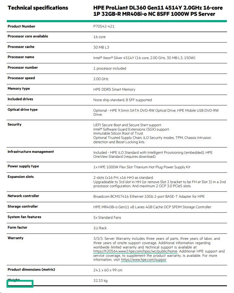 | Model Name | HPE ProLiant DL360 Gen11 4514Y 2.0GHz 16-core 1P 32GB-R MR408i-o NC 8SFF 1000W PS Server |