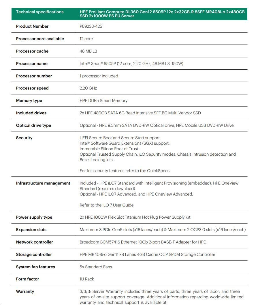 HPE PL DL360g12 6505P (2.2G/12C) 2x32G (P69727) 2x2.4TB MR408i-o 8SFF 2x1000W 2p10GbE NBD333 Smart Choice