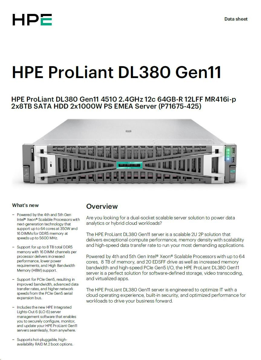 Model Name HPE PL DL380g11 4510 (2.4/12C/30M) 2x32G 2x8TB 2x1000W MR416i-p 12LFF 4x1Gb NBD333 2U