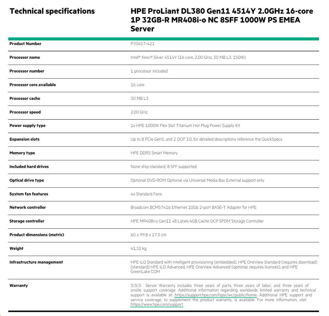 | Model Name | HPE ProLiant DL380 Gen11 4514Y 2.0GHz 16c 1P 128GB-R 8SFF NS204i-u NC BCM57416 2x1000W PS EU Server |