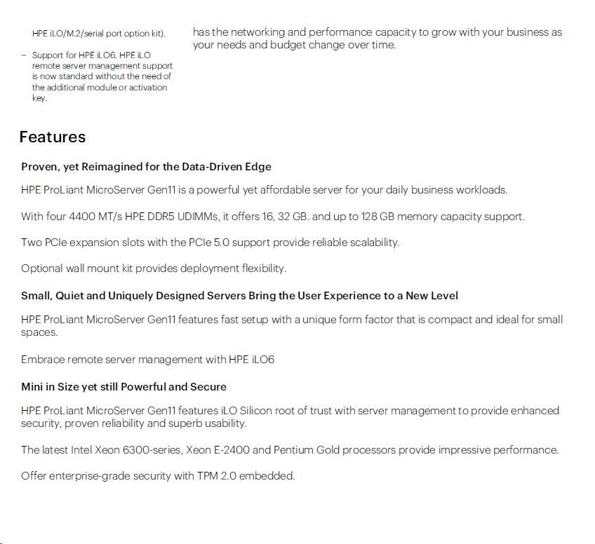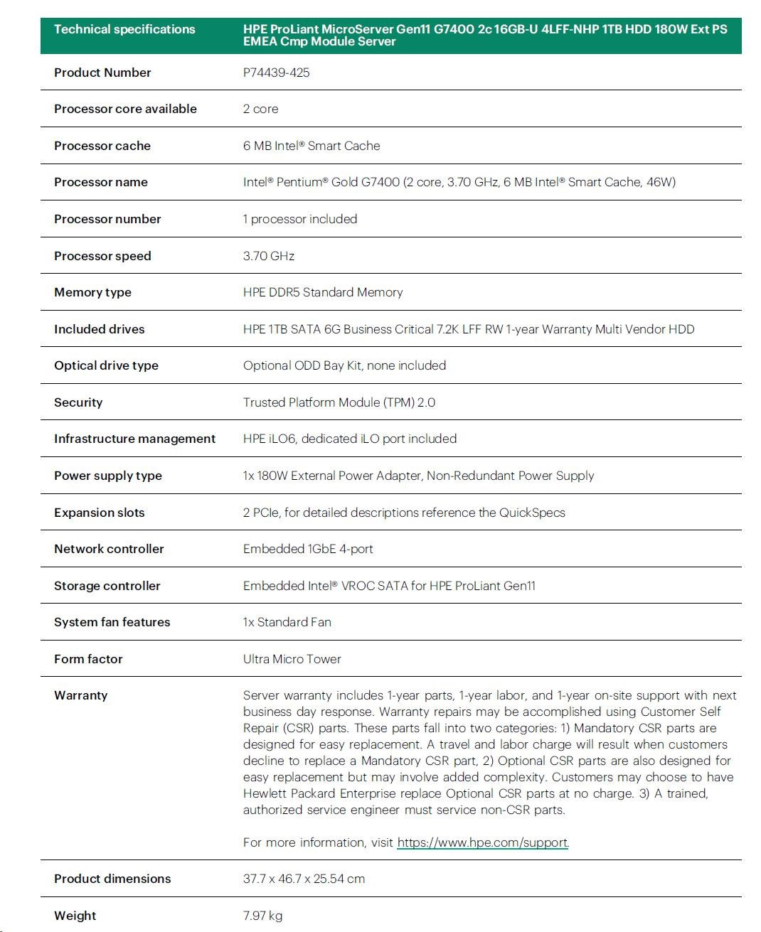 | P74439-425: HPE ProLiant MicroServer Gen11 G7400 2c 16GB-U 4LFF-NHP 1TB HDD 180W Ext PS EMEA Cmp Module Server |
