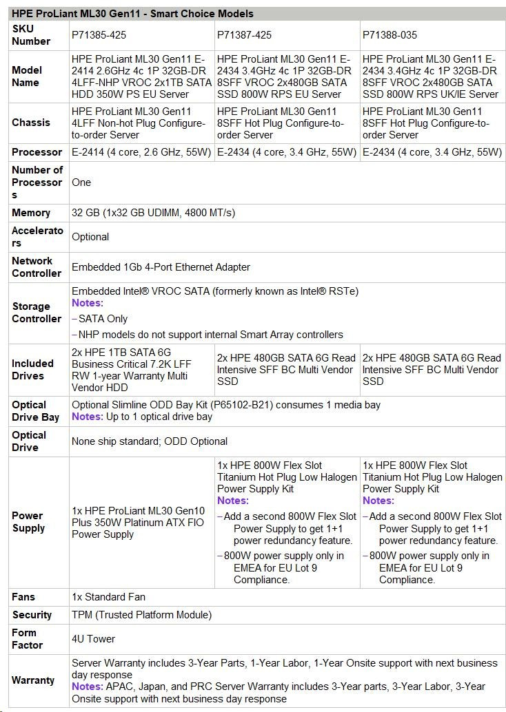 | 1 | P65090-B21 | HPE ProLiant ML30 Gen11 4LFF Non-hot Plug Configure-to-order Server |
