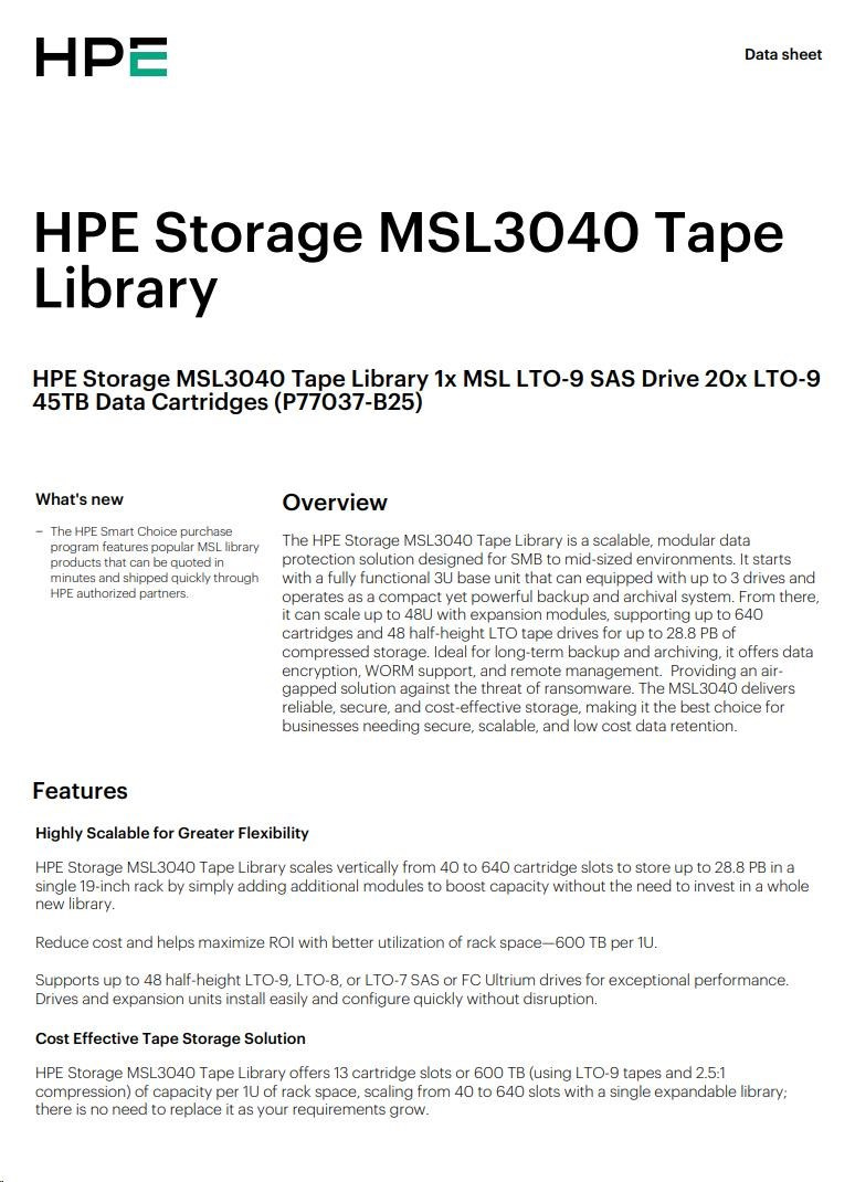 HPE Storage MSL3040 Tape Library 1x MSL LTO-9 SAS Drive 20x LTO-9 45TB Data Cartridges.