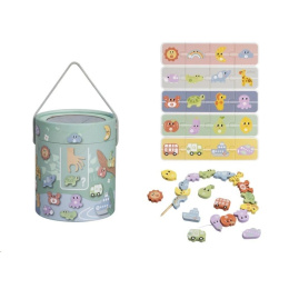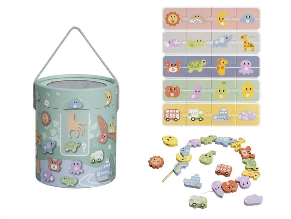 Balení obsahuje: kyblík, 20 dřevěných předmětů v podobě očíslovaných zvířátek, ovoce, dopravních prostředků a motivů z oblohy, 20 hracích kartiček v podobě puzzle, 2 provázky k navlékání.