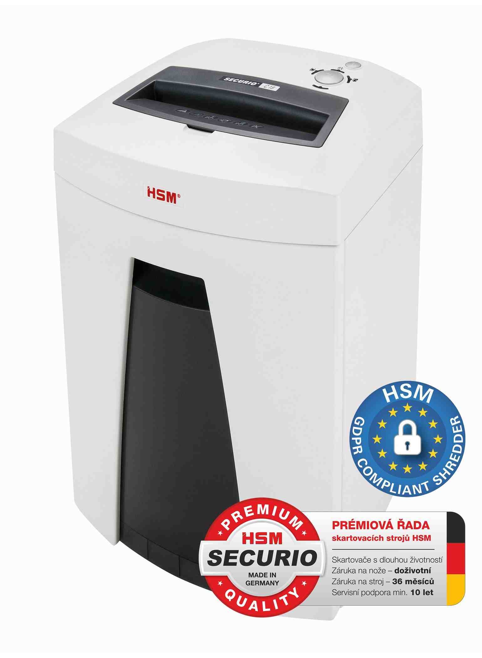 Skartovací stroj řady HSM SECURIO v kategorii ke stolu se zvýšeným výkonem. Masivní ocelové nože umožňují skartování papíru i s kancelářskými sponkami a zpracování plastových karet. Tato verze je vhodná pro uživatele, kteří požadují vyšší stupeň utajení. Doba chodu je omezena tepelnou pojistkou.