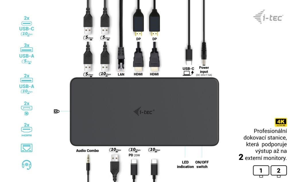 Výkonná kancelářská dokovací stanice podporující superrychlé porty USB Gen 2 s rychlým nabíjením. Dokovací stanice podporuje výstup až na dva externí monitory ve vysokém rozlišení až 4K. Dokovací stanici lze použít prakticky se všemi notebooky, protože podporuje připojení ke všem běžným portům: 3.0, USB-C a Thunderbolt“ 3/4 a zároveň podporuje všechny běžné současné operační systémy.