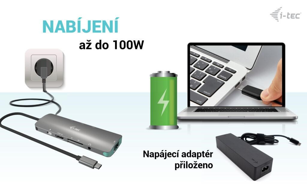 K dokovací stanici je rovněž přiložen napájecí adaptér USB-C o celkovém výkonu 100 W (USB-C port: 100 W)