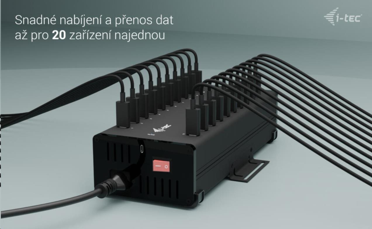 Tento moderní HUB nabízí 20 USB-C s funkcí Plug & Play a nabíjením až 15W na port. Díky tomu, že HUB má 20 USB portů, je možno nabíjet až 20 zařízení najednou.