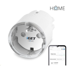 Chytrá zásuvka ovládaná přes WiFi, kompatibilní s aplikací iGET HOME, Google Assistant a Amazon Alexa, měření spotřeby energie, max. zatížení 3680 W, aplikace pro Android a iOS zdarma v češtině, nastavení časovačů, statistiky.