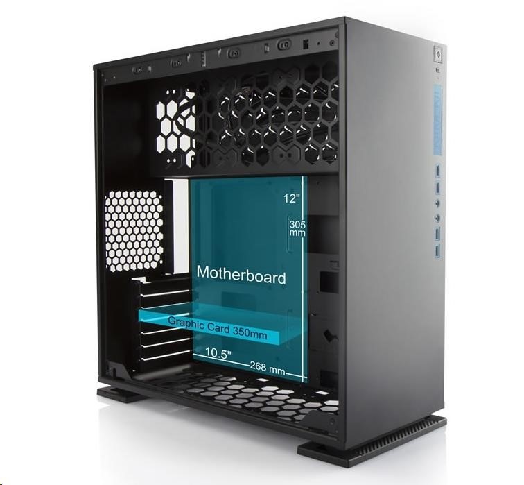 - Vevnitř je prostor pro grafickou kartu až do délky 350mm a CPU chladič až do velikosti 160 mm.