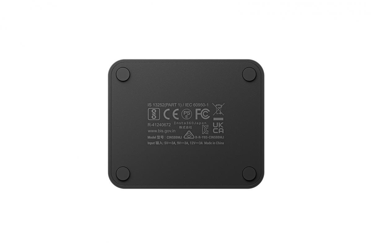 Nabíjecí hub pro tři baterie pro kameru Insta360 X4. Hub nabije 2290 mAh akumulátor za 43 minut (za 26 minut na 80%). Váha: 109g Rozměry: 75 x 62 x 34 mm.