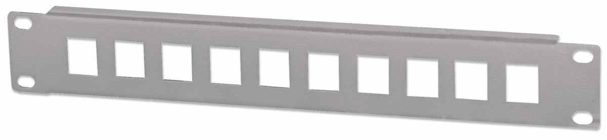 10" Blank Patch Panel 1U, Ten Ports, Gray SKU: 714969 Highlights 10" rackmountable Ten blank ports for keystone jacks Color: Gray RAL7035 1U Dimensions 7 (L) x 254 (W) x 44.45 (H) [mm] 0.28 (L) x 10 (W) x 1.75 (H) [in] Package Contents 10" Blank Patch Panel Set of four cage nuts.