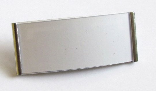 Mírně vyklenutá, magnetická jmenovka s okénkem o rozměru 79×31 mm. Vnitřní rozměr 73×30 mm. Část jmenovky určená k popisu je chráněna čirým tuhým plastem s ochrannou snímatelnou fólií. Provedení lesklý hliník – dodává jmenovce luxusní vzhled. Možnost uchycení na oděv pomocí magnetu (40×18 mm). Magnet je dostatečně silný k tomu, aby jmenovku přes oděv udržel..
