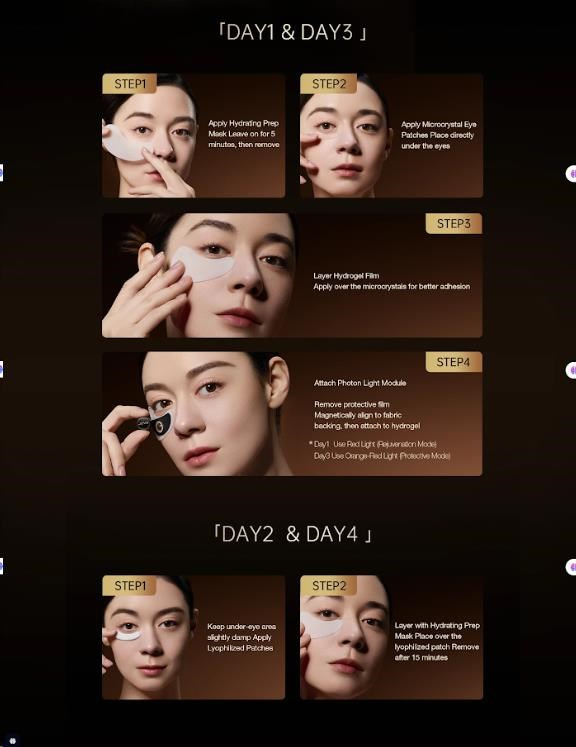 • Den 2 a 4 (Intenzivní výživa): Aplikujete lyofilizované náplasti s hydrolyzovaným kolagenem a peptidy a překryjete je hydratační maskou na 15 minut.