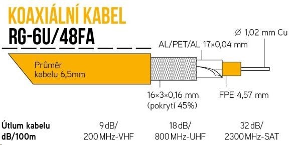 Koaxiální kabel RG-6U/48FA 6,5 mm, duální stínění, impedance 75 Ohm, PVC, bílý, rollbox 305m