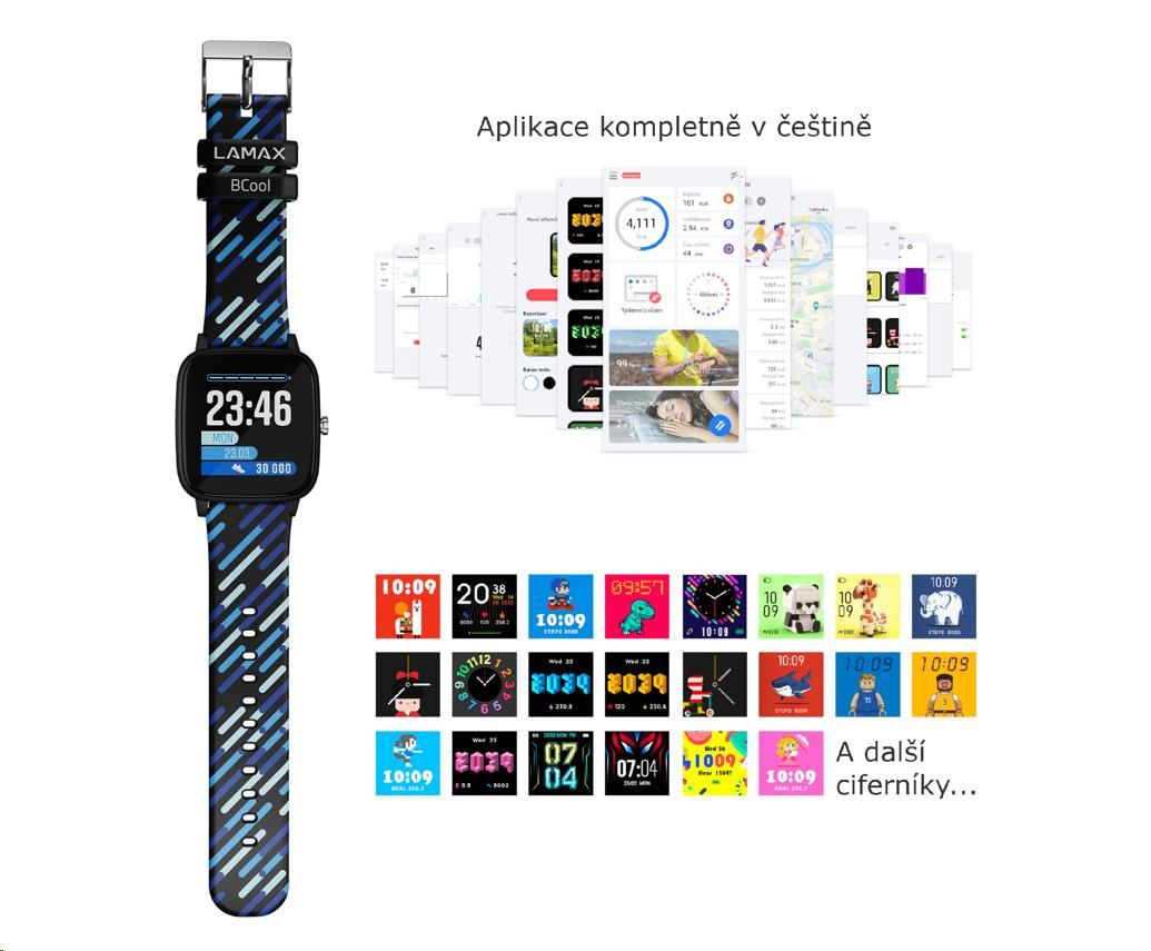Chytré hodinky pro děti LAMAX BCool, výdrž až 7 dní, měření kroků, tepu a sportovních aktivit, analýza spánku, voděodolnost IP68, ovládání hudby, superjemný 1,4“ displej, podpora Android/iOS, 4 vzdělávací hry, dva řemínky v balení, slimfit design pro dětskou ruku, čeština.