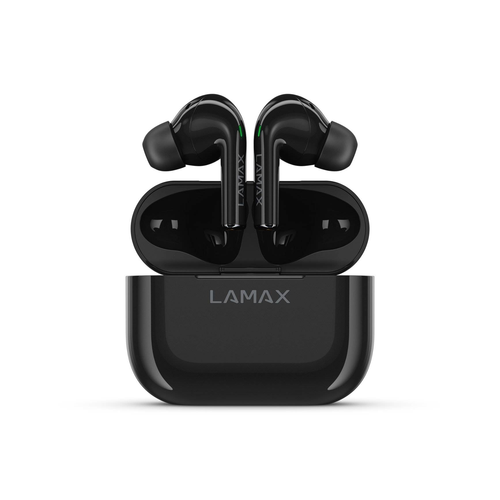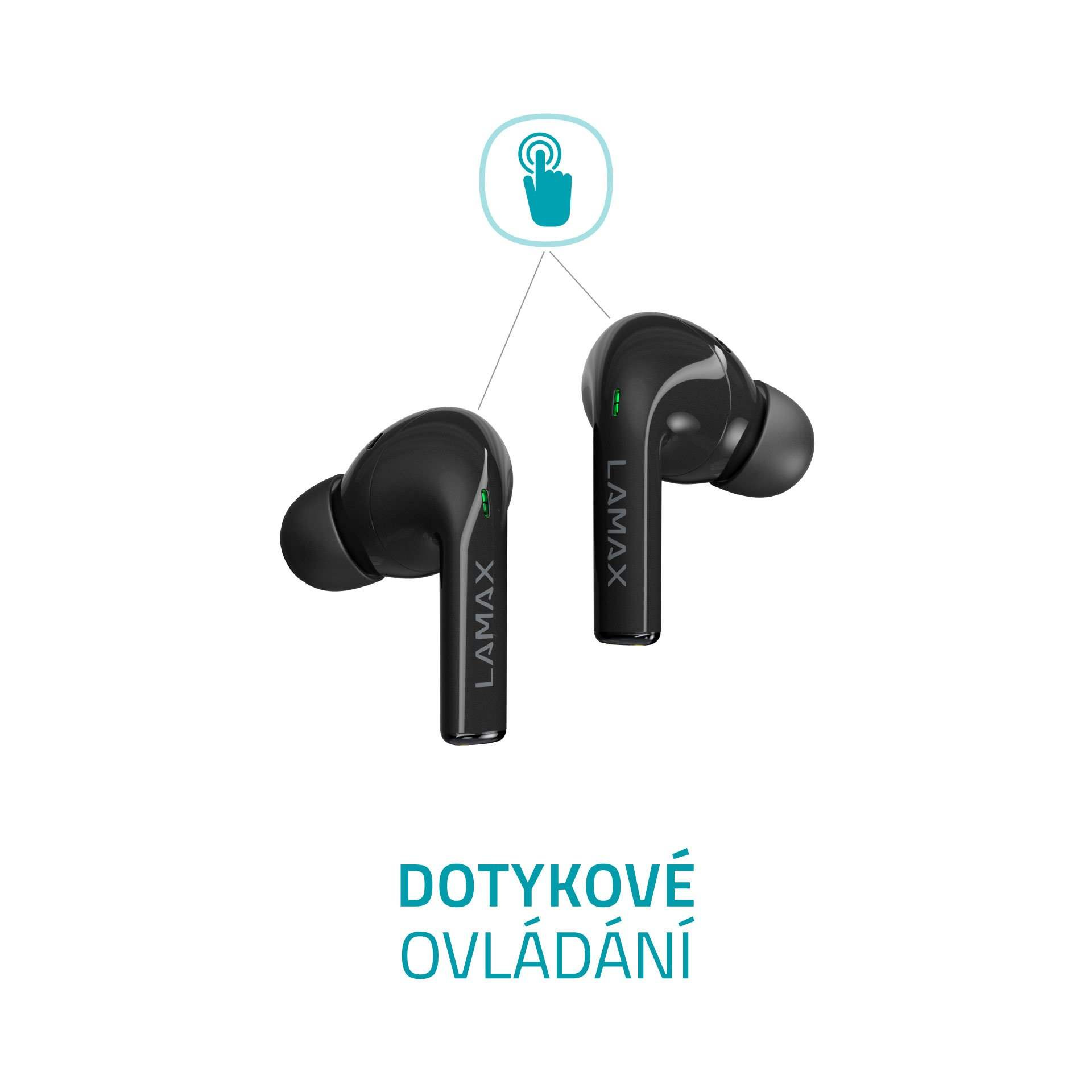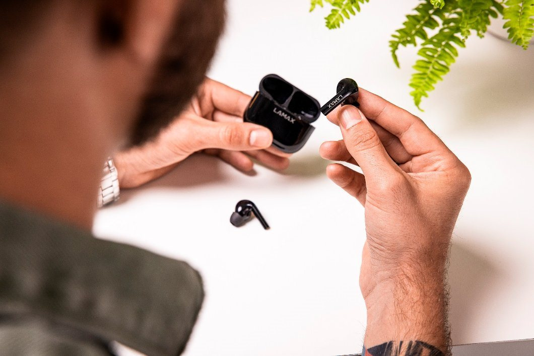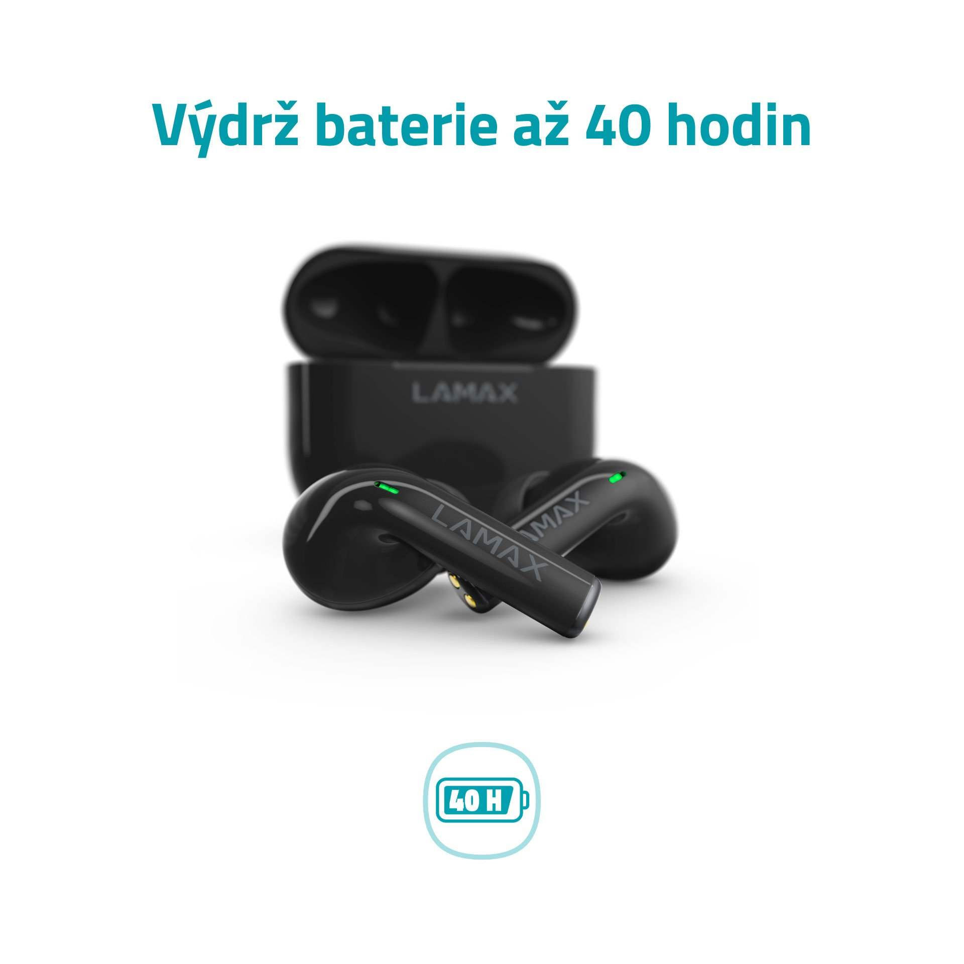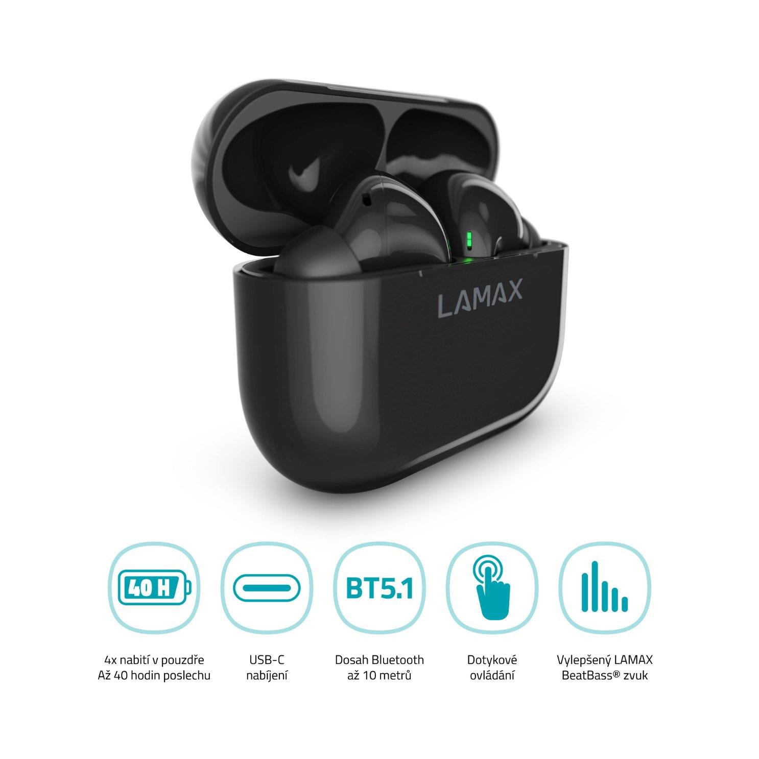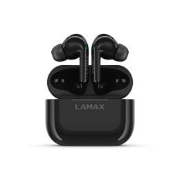 Bezdrátová TWS sluchátka, do uší, 8h výdrž/1 nabití, 40 hodin výdrž celkem, Bluetooth 5.1, dosah až 10 metrů, dotykové ovládání, USB-C, LAMAX BeatBass® technologie, automatické párování, herní režim, malé nabíjecí pouzdro, ukazatel nabíjení, kodeky AAC a SBC, podpora hlasových asistentů, náhradní náušníky..