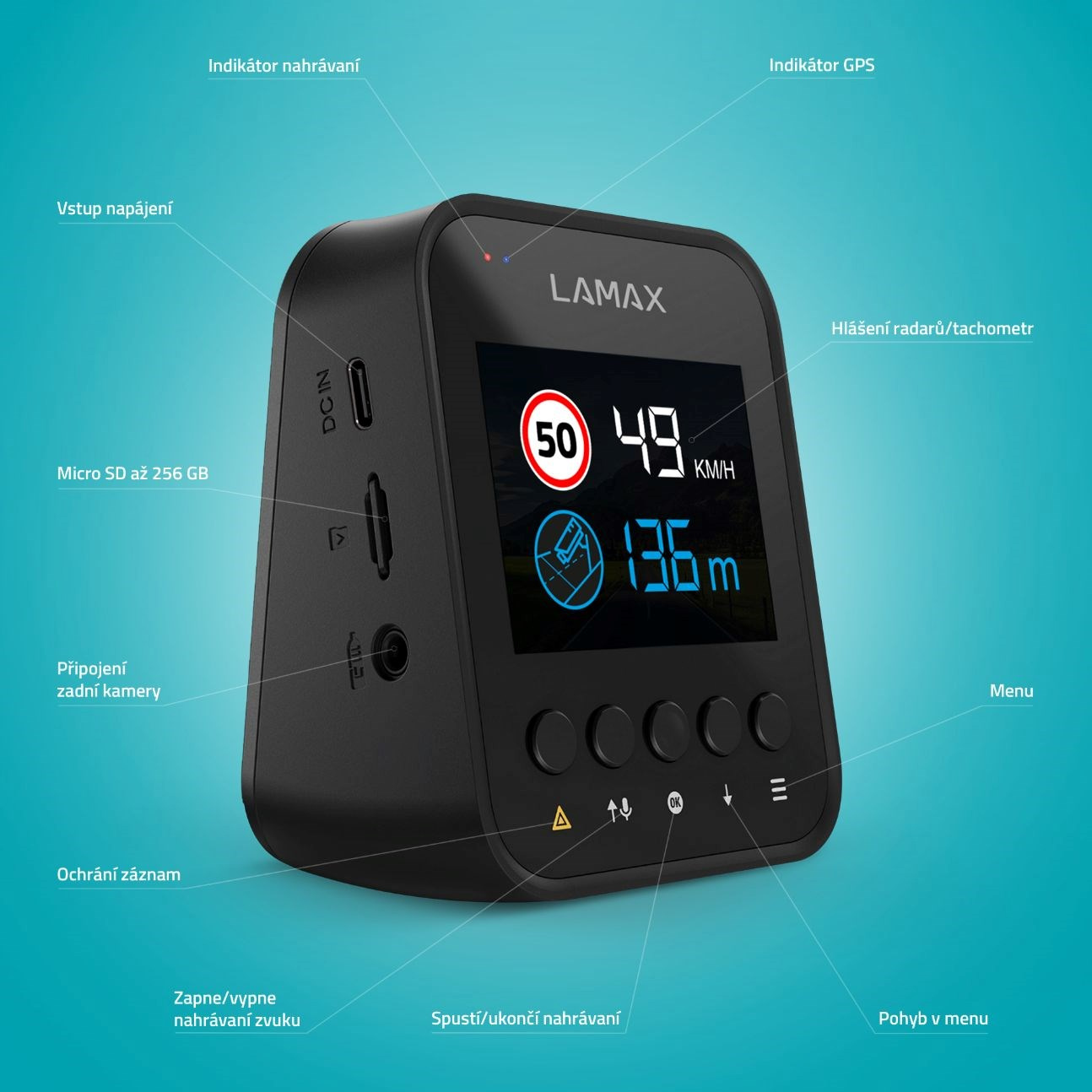 Funkce GPS zaznamená do záběrů souřadnice i další údaje, takže získáš dokonalý důkaz pro policii nebo pojišťovnu. Kamera ti taky poskytne info o rozmístění radarů.