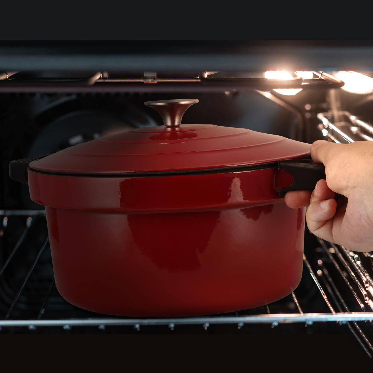 Litinový 6l smaltovaný vnitřní hrnec je možné bez problémů vyjmout a vložit do trouby či postavit na různé typy sporáků. Vydrží teplotu až 250°C.