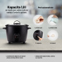 Nádoba rýžovaru má kapacitu 1,8 l, která bohatě stačí k přípravě rýže nebo jiného pokrmu pro celou rodinu. Výhodou je funkce Keep warm, která udrží rýži teplou klidně celý den. Rýžovar se do tohoto módu přepne automaticky po dokončení vaření.