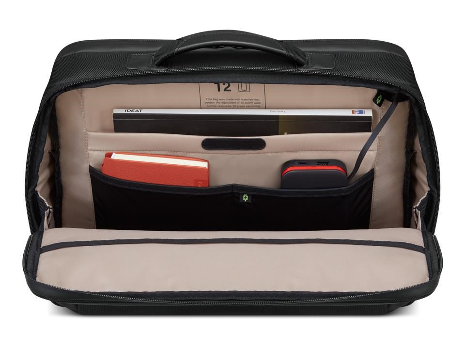 - Hlavní přihrádka je vybavena plnohodnotným pracovním prostorem a úložnými kapsami na příslušenství a další drobné předměty, včetně kapsy s blokováním RFID a klíčenky