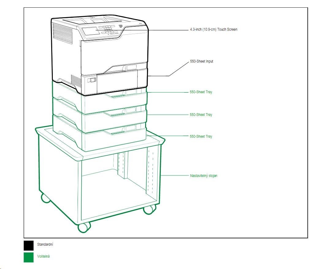 Tiskárna Lexmark CS727de tiskne rychlostí až 38 stránek za minutu, takže poskytuje vysokou rychlost tisku pro produktivitu podnikové třídy. Má vstupní kapacitu až 2300 listů, dotykový displej a barvy PANTONE..