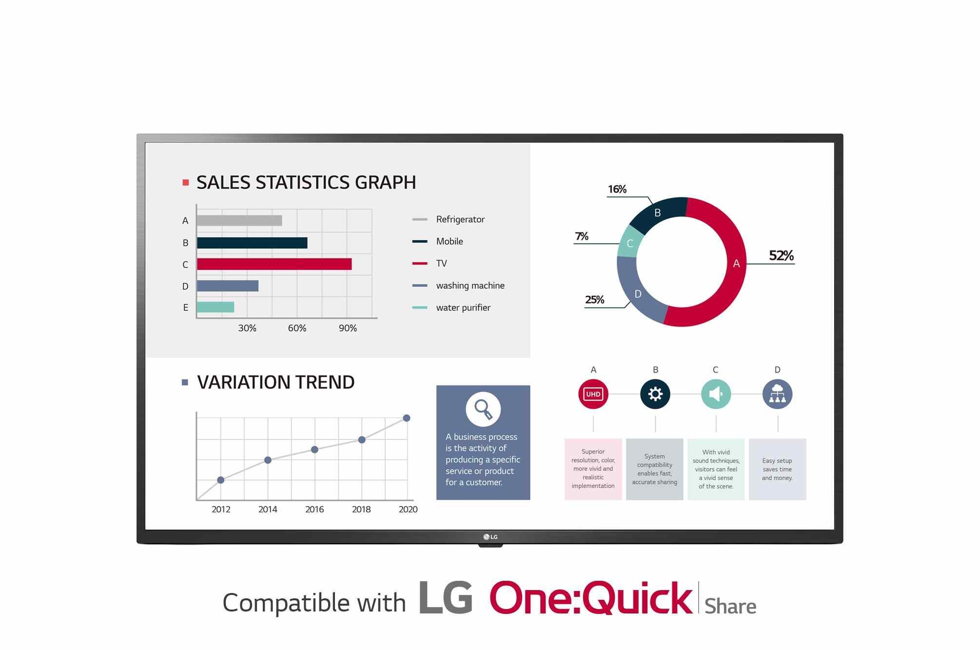 Vestavěný čtyřjádrový procesor SoC může provádět několik úkolů najednou a současně zajistit plynulé přehrávání obsahu bez potřeby přehrávače médií. Platforma LG webOS smart signage také zvyšuje pohodlí uživatelů pomocí intuitivního grafického uživatelského rozhraní a jednoduchých nástrojů pro vývoj aplikací.