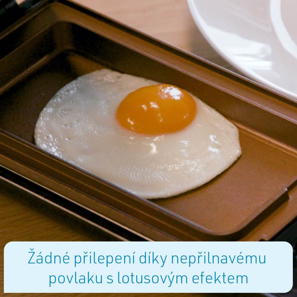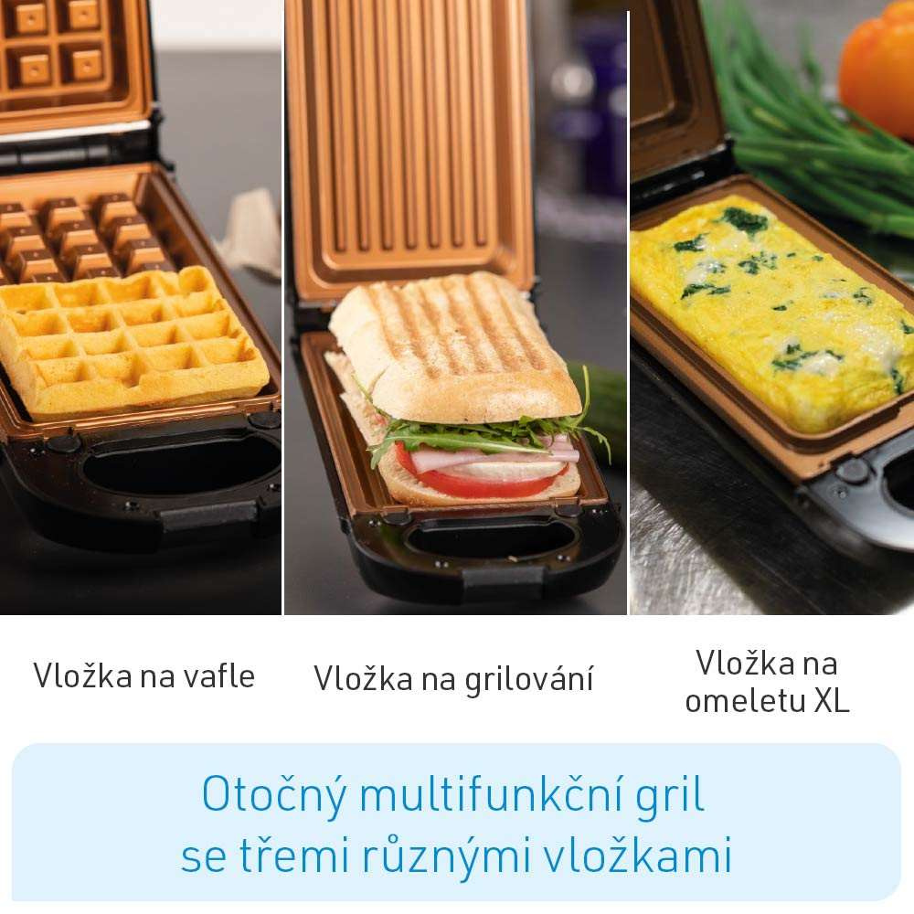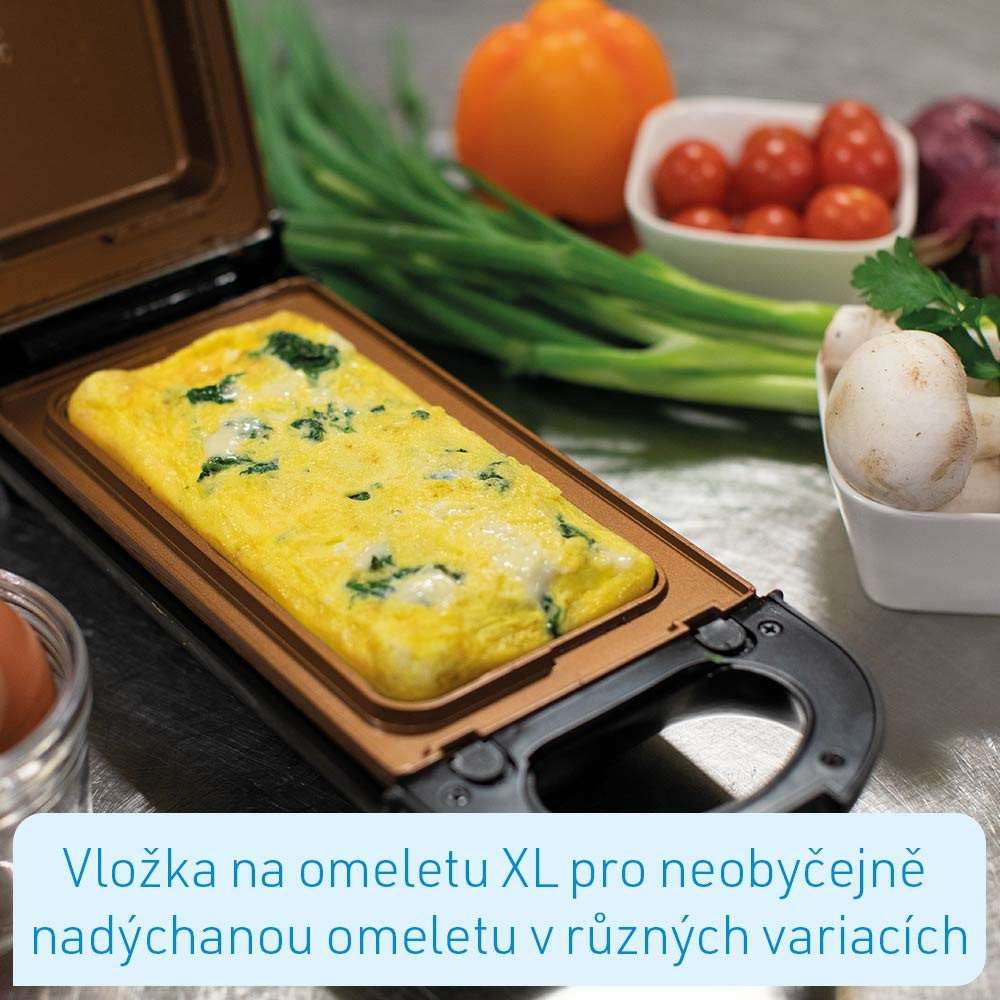 - Včetně 3 vyměnitelných vložek pro přípravu XL omelet, grilovaný specialit a vaflí
