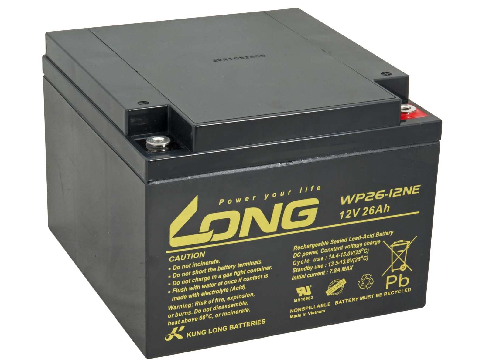 Rozměry: 166 x 175 x 125mm Parametry: Konektory: M5 Napětí: 12V Kapacita: 26Ah Rozměry (d x š x v): 166 x 175 x 125mm Rozměrové tolerance: 166(+2-1) x 175(+2-1) x 125(+2-1)mm Hmotnost: 9,3kg Elektrolyt: AGM Typ akumulátoru: DeepCycle VRLA - Ventilem řízený olověný akumulátor z anglického Valve Regulated Lead Acid je typ bezúdržbového akumulátoru, který lze provozovat v libovolné poloze, protože elektrolyt není v tekutém stavu. Hlavní vlastnosti akumulátoru jsou spolehlivost, dlouhá provozní životnost, otřesuvzdornost a vysoká kvalita zpracování. AGM - Akumulátor s elektrolytem nasáknutým do netkané textilie ze skelného vlákna (Absorbed Glass Mat) DeepCycle - Akumulátor určený pro cyklické vybíjení a nabíjení s možností hlubokého vybití, často nazývaný jako trakční baterie. Nejčastější aplikace a oblasti využití: - Elektrické invalidní vozíky a skútry - Rybářské čluny a lodě - Echoloty a sonary - Golfové vozíky - Fotovoltaické systémy - Karavany, obytné vozy a kempování - Dětská elektrická vozítka a hračky - Semafory, výstražné značení pro řízení dopravy - Manipulační technika a vysokozdvižné vozíky - Zahradní traktory a sekačky.