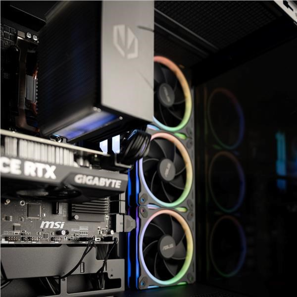 Stylová skříň s prosklenou bočnicí a čtyřmi ARGB ventilátory .