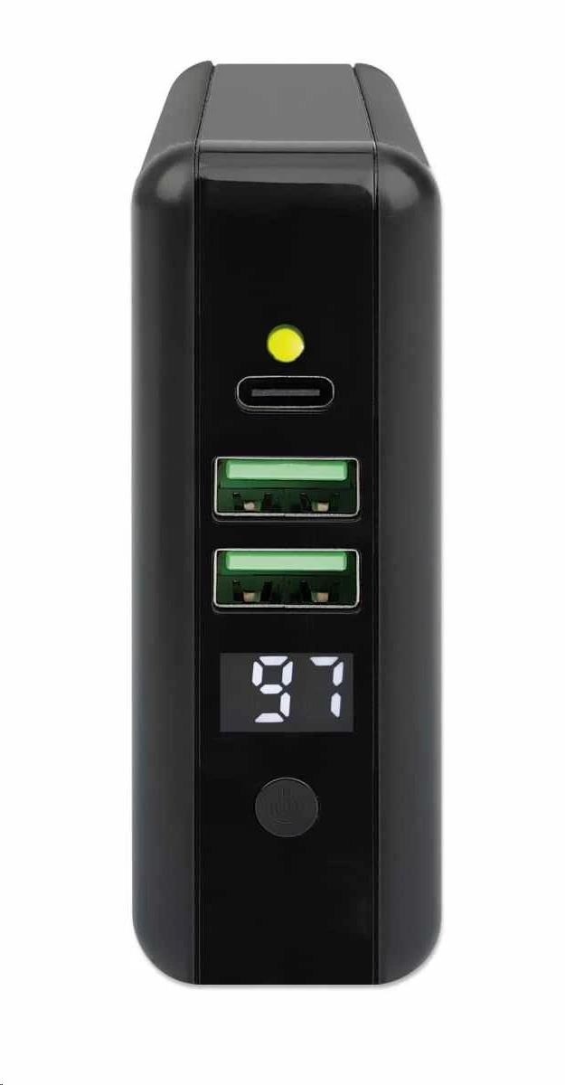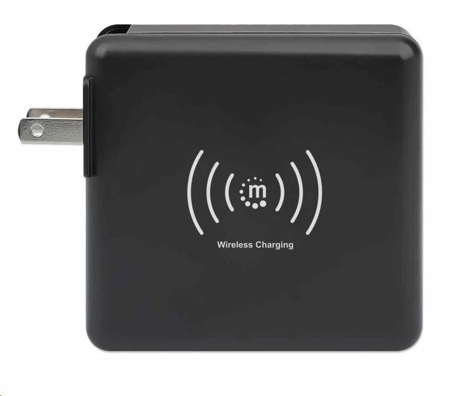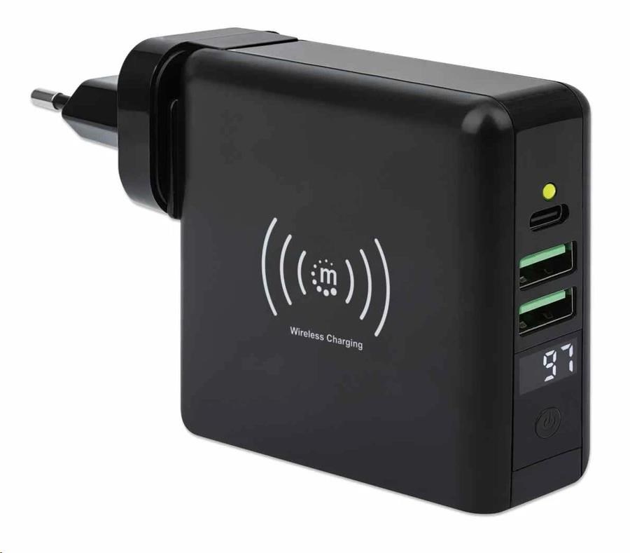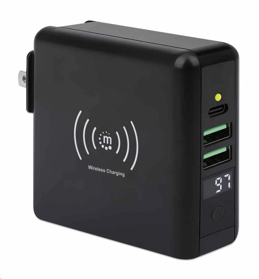 The Manhattan 4-in-1 Travel Wall Charger and Powerbank 8,000 mAh provides you with incredibly useful functions on one device. Use it as a USB wall charger to charge smartphones, tablets, eReaders, headphones and more from two USB-A and one USB-C port with per-port power up to 5 V / 2.4 A. You can also skip the wires altogether and charge compatible mobile devices on the 5 W wireless charging pad. For even more convenience, this all-rounder lets you charge on the go without plugging into a socket since it's also an 8,000 mAh powerbank. Its convenient digital number display lets you check the remaining battery at any time. Recharge the powerbank directly via AC on a power outlet or through its USB-C port. Finally, if you're an international traveler, you'll love its foldable US and swappable UK and EU plugs that let you charge devices in the many regions that offer these outlet types.