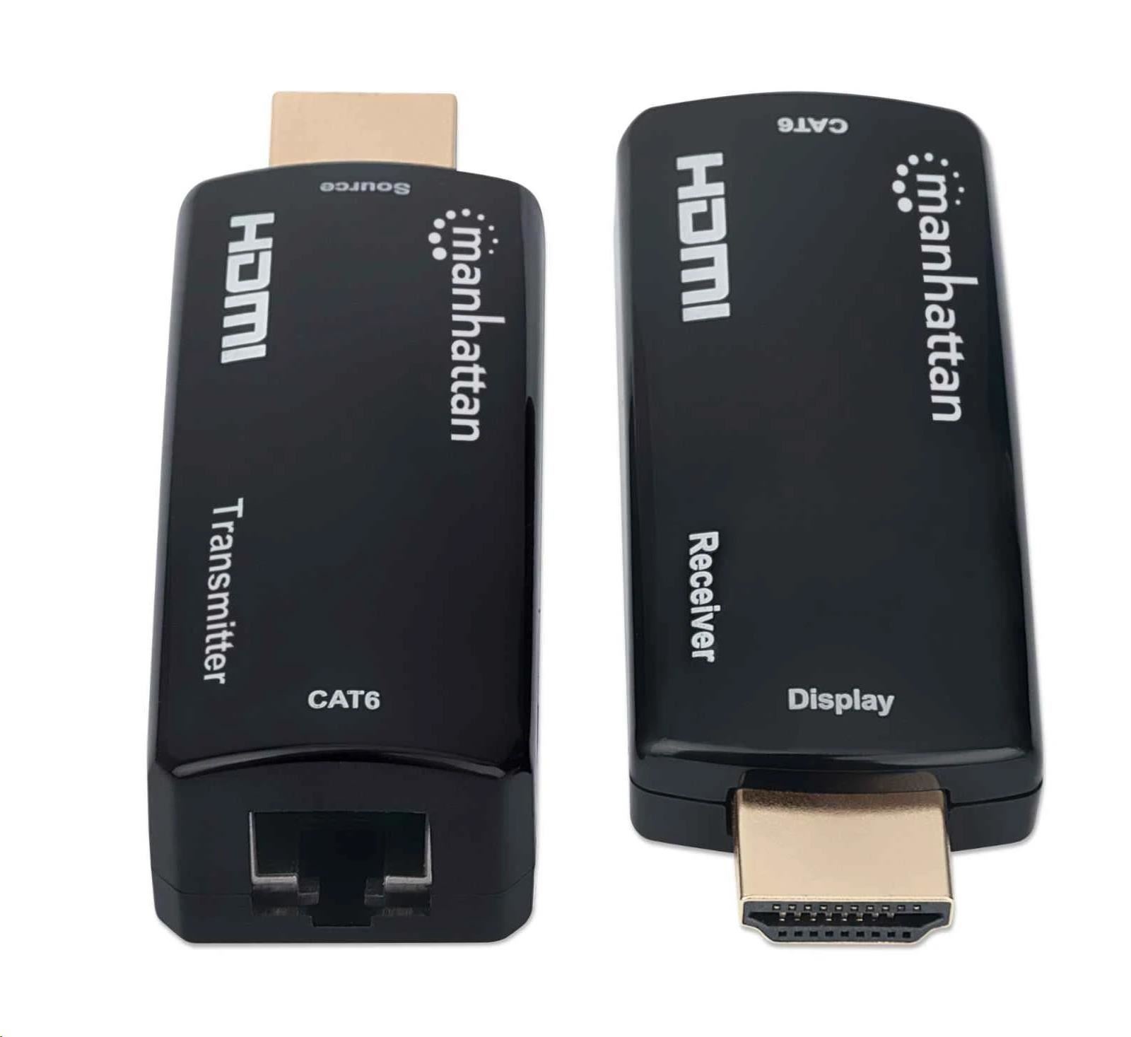 The Manhattan 1080p Compact HDMI over Ethernet Extender Kit can connect nearly any digital HDMI source (e.g., gaming console [PlayStation®, Xbox® and more], Blu-ray player, satellite receiver, digital recorder, etc.) to an HD display or projector at a distance up to 60 m (196 ft.) with one Cat6 Ethernet cable. The Kit provides reliable 1080p@60Hz resolution video and multichannel audio transmission over longer distances than HDMI cables alone. Its slim and compact design is ideal for installations in confined spaces or virtually anywhere.