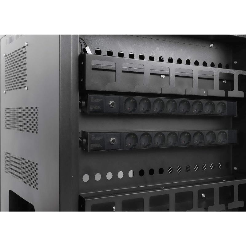 Vestavěné AC zásuvky v PDU na zadní straně jednotky usnadňují nabíjení zařízení, jako jsou notebooky, notebooky, tablety, telefony a mnoho dalších pomocí jejich napájecích adaptérů nebo nástěnných nabíječek. Správci mají pohodlný přístup přes dvířka na zadní straně jednotky, aby se mohli zapojit do zásuvek a přivést kabely k zařízením v přední části.
