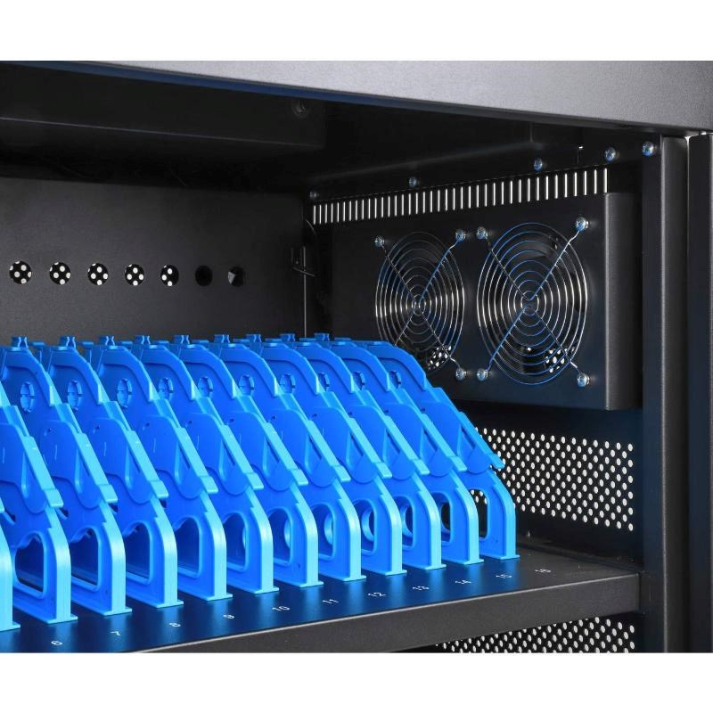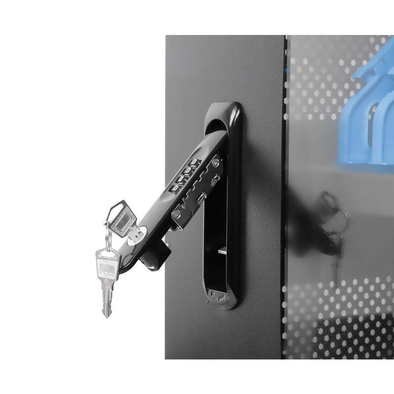 Pevný a odolný ocelový kryt tohoto nabíjecího vozíku nabízí viditelnou známku profesionální správy a ochrany zařízení. Zámek na předních a zadních dveřích lze otevřít čtyřmístnou kombinací nebo dvěma přiloženými klíči, které pomáhají udržet zařízení v bezpečí, když se nabíjejí nebo když se nepoužívají. Zahrnutá robustní kolečka vám umožní přemístit vozík, kam potřebujete; zámky kol umožňují rychlé zajištění na místě.