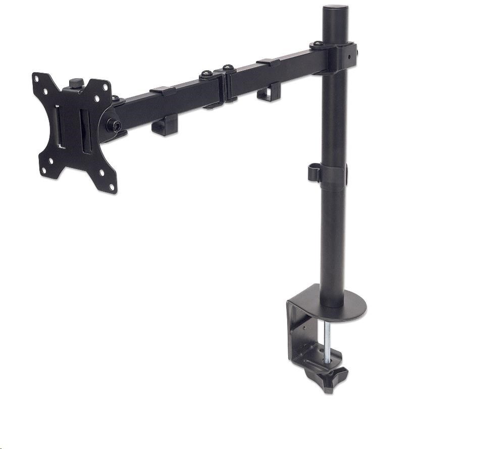 Constructed from durable steel, this single monitor mount features a sturdy clamp that allows for quick, easy and secure mounting without the need to drill holes into desks or countertops. Effectively accompanying a larger display or computer screen, its fully adjustable tilt, rotate, side-to-side, height and tension settings create the perfect position to comfortably increase productivity. Such adjustment capabilities can even help reduce eye fatigue or neck and back strain. In addition, the mount pole offers easy monitor rotation to allow others to view presentations and multimedia productions from almost any direction.