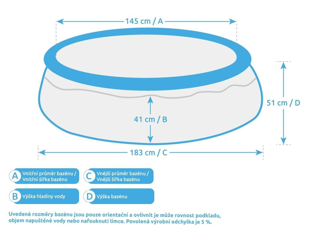 Uvedené rozměry bazénu jsou pouze orientační a ovlivnit je může rovnost podkladu, objem napuštěné vody nebo nafouknutí límce. Povolená výrobní odchylka je 5 %.