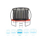 Vnitřní ochrannou síť najdete přímo v balení, nemusíte si ji dokupovat zvlášť. Vnitřní ochranná síť je bezpečnější než vnější síť - brání přístupu skákajícího do části s pružinami. Vstupní prostor je zajištěn třemi přezkami a brání vypadnutí. Tyče jsou obaleny ochranným návlekem z měkčené pěny. Nohy trampolíny jsou samostatné a zvyšují stabilitu celé trampolíny. Spojení tyčí nohou trampolíny a sítě je jištěno speciálními sponami.