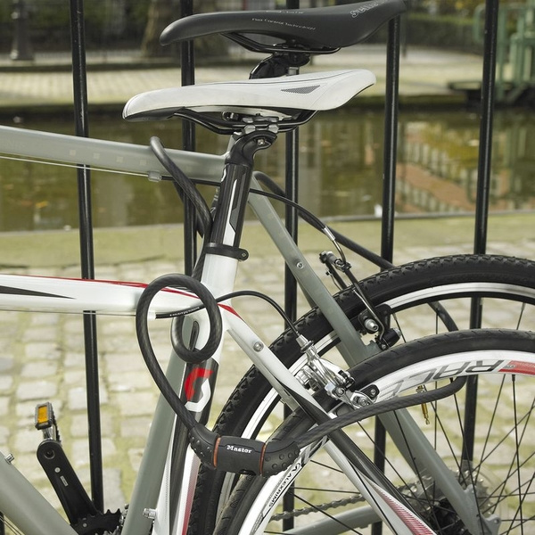 Ocelové pletené lanko o průměru 12 mm a délce 1 800 mm má vinylový potah, který zabraňuje poškrábání. Obsahuje integrovaný zámek na klíč, součástí balení jsou 4ks klíčů. Součástí balení je i držák pro praktické skladování.