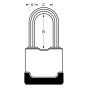 - Visací zámek o šířce 54 mm s tělem z laminované oceli s povrchovou úpravou odolnou proti povětrnostním vlivům.