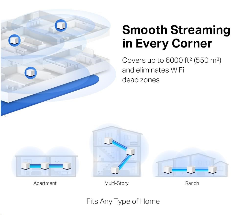 - Pokrytí celé domácnosti – pokrytí prostoru až 6 000 ft2 (550 m2) vysokorychlostní sítí Wi-Fi, eliminující mrtvé zóny Wi-Fi ve vaší domácnosti.