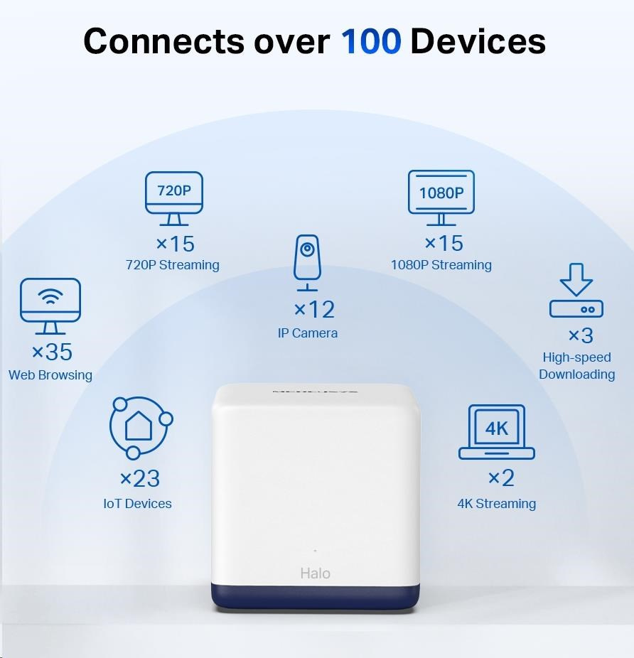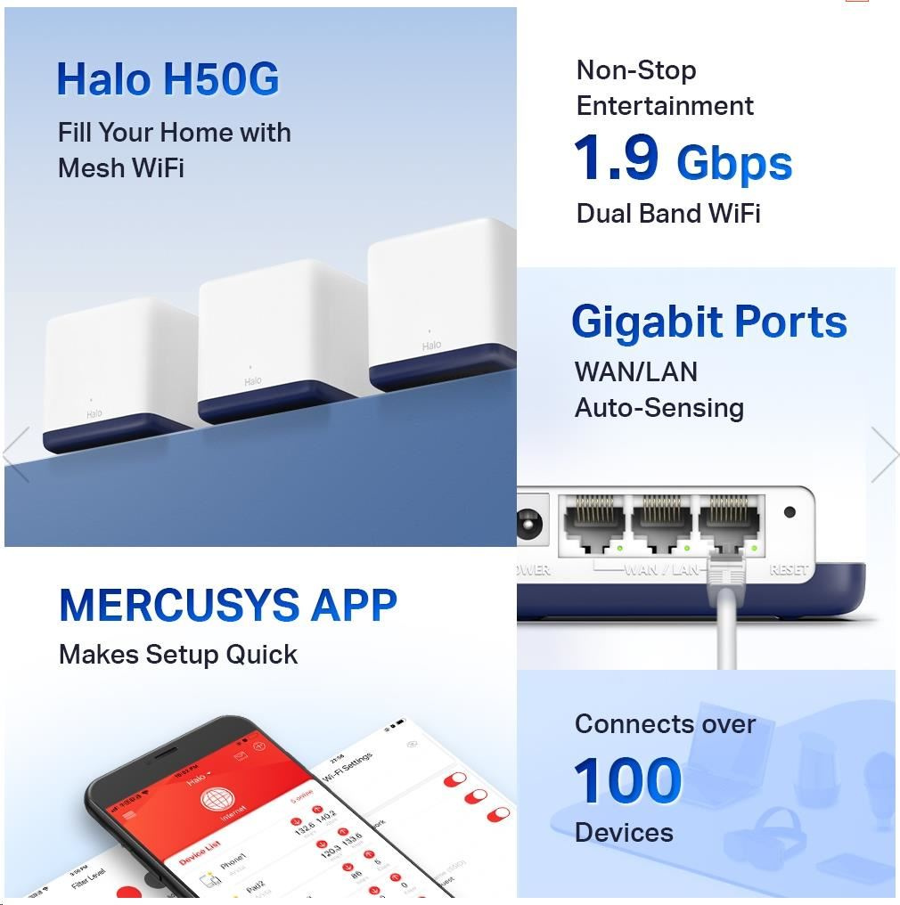 - Dvoupásmová Wi-Fi s rychlostí 1,9 Gbit/s – zařízení Halo H50G poskytuje rychlé a stabilní připojení pro až 100 zařízení s rychlostmi až 1 900 Mbit/s a je kompatibilní s většinou poskytovatelů internetových služeb (ISP) a modemů.