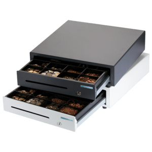 cash drawer, front opening, dimensions (WxHxD): 410x114x415mm, insert: 6 note compartments, 8 coin compartments, 1 receipt compartment, direct printer connection, RJ12, colour: white (glossy).