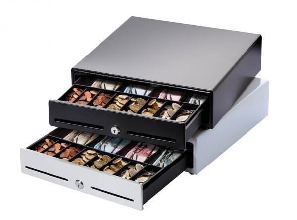 cash drawer, front opening, dimensions (WxHxD): 330x101x330mm, insert: 4 note compartments (horizontal), 8 coin compartments, 1 receipt compartment, 3-pos. lock, direct printer connection, RJ12, colour: white.