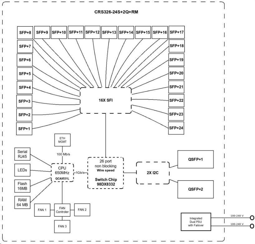 Switch má celkově 2x QSFP+ porty a 24x SFP+ portů, což poskytuje celkovou propustnost 320 Gbps a přepínací kapacitu 640 Gbps s rychlostí přeposílání 252 Mpps u většiny běžných paketů.