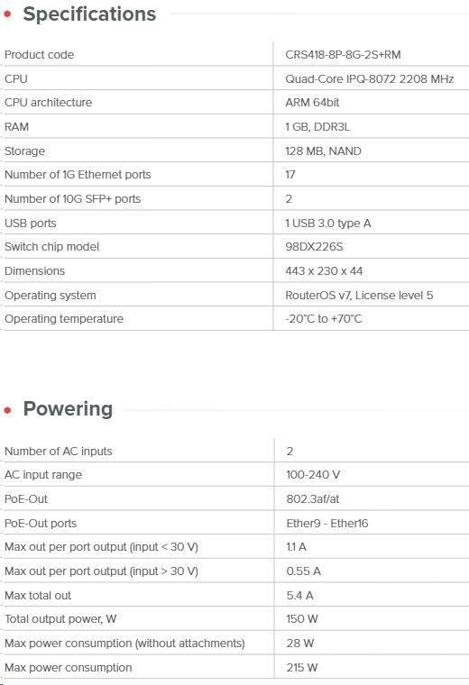 PoE CRS switch s 16x Gbps LAN (8 z nich s POE-out) , 2x 10Gbps SFP+, 1x USB 3.0 a dvěma RJ45 porty (management a konzole) v rack provedení. CRS418-8P-8G-2S+RM je dostatečně výkonný na to, aby nahradil většinu routerů pro malé a střední kanceláře. Vhodný především pro hybridní sítě na 2/3 vrstvě - ať už segmentujete síť pomocí VLAN, nebo mezi nimi routujete. Díky čtyřjádrovému procesoru ARM s frekvencí 2,2 GHz, HW offloading L3 a systému RouterOS v7 jej můžete používat jako internetovou bránu, firewall, a dokonce i jako řadič CAPsMAN. Využít můžete 8 PoE-out portů (802.3af/at a 24V pasivní PoE-out) pro napájení zařízení přímo ze switche s až 150 W celkového výkonu, inteligentním řízením PoE a omezením proudu na port. Praktické řešení pro instalace vyžadující nepřetržitý provoz s enormními objemy dat Technické specifikace: Product code: CRS418-8P-8G-2S+RM CPU: Quad-Core IPQ-8072 2208 MHz Size of RAM: 1 GB, DDR3L Storage: 128 MB, NAND Number of 1 GbE Ethernet ports: 17 10G SFP+ ports: 2 USB ports: 1 USB 3.0 type A Operating system: RouterOS v7 (License level 5) Supported input voltage: 2x AC power supply 100 - 240 V Dimensions: 443 x 230 x 44 mm Operating temperature: -20°C to +70°C Napájecí specifikace: PoE-out: 802.3af/at PoE-out ports: Ether9 - Ether16 Max out per port output (input < 30 V) : 1.1 A Max out per port output (input > 30 V): 0.55 A Max total out : 5.4 A Total output power, W: 150 W Max power consumption: 215 W Max power consumption without attachments: 28 W Upozornění: Výrobce MIKROTIK nevztahuje záruku na zařízení poškozená přepětím. Zařízení je třeba na vstupech adekvátně chránit proti indukovanému elektrostatickému přepětí či přepěťovým špičkám na silovém vedení. Při venkovních instalacích je třeba používat stíněnou kabeláž (FTP/SFTP), příslušné přepěťové ochrany (pokud nejsou integrovány) a provést korektní a efektivní uzemnění. Zařízení vždy provozujte s poslední výrobcem publikovanou verzí (výrobcem označenou "Stable") operačního systému RouterOS. Taková verze garantuje nejoptimálnější funčknost, obsahuje opravené chyby z verzí předchozích a výkonová vylepšení. .