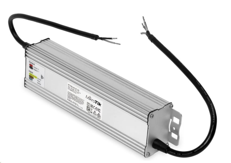Venkovní AC/DC napájecí zdroj v odolném kovovém šasi s výstupním napětím 53 V, max. výstupním proudem 4.7 A, celkovým výkonem 250 W vhodné pro řadu produktů netPower od MikroTiku. Šasi má certifikaci IP67 s extra ochranou proti prachu a vlhkosti. Zdroj je zakončen dvěmi odholenými kabely bez konektorů - vstupní 3-žilový AC kabel 230 V AC (100 - 240 V AC) a výstupním DC kabelem.